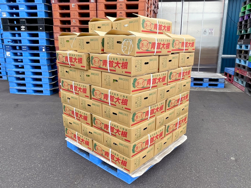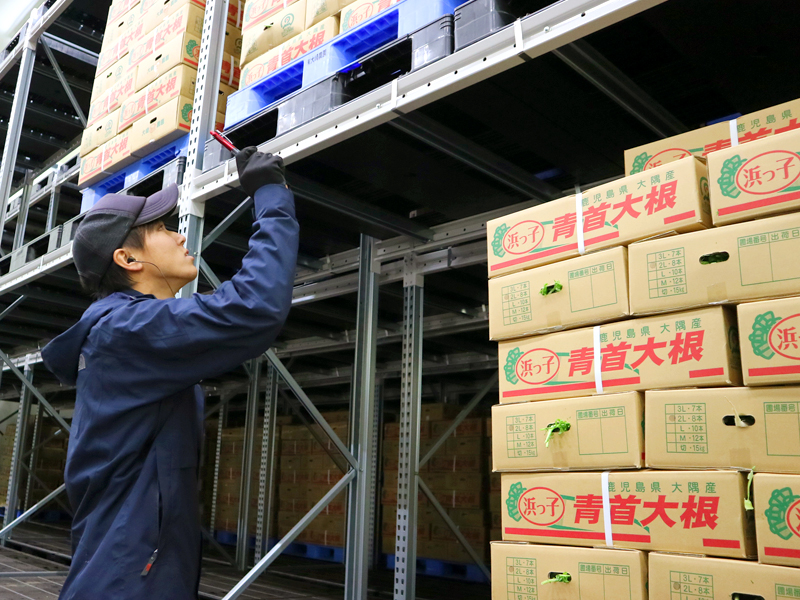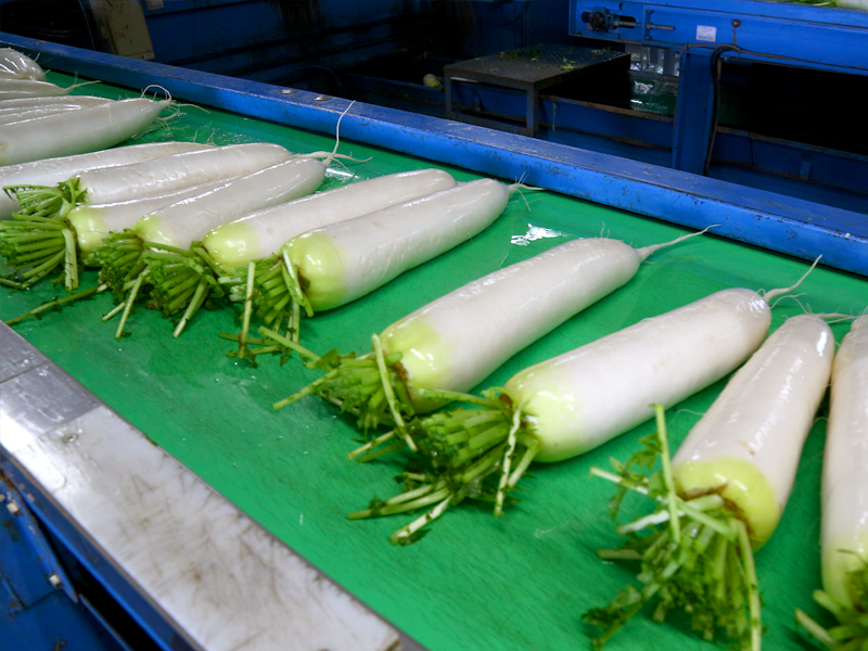 選果が終わった野菜は、すぐに包装ラインでパッキングを行います。パッキング後の大根は、4℃に保たれた冷蔵倉庫で保存し、販売計画通りに、九州を中心に関西や関東に向けて出荷します。